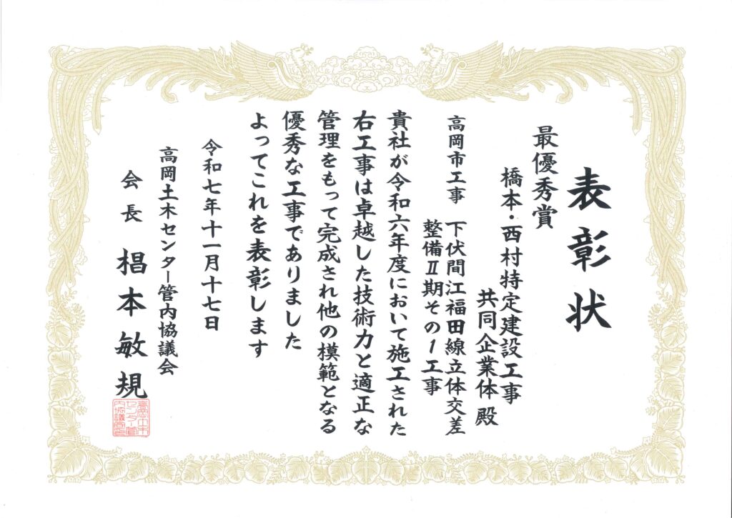 高岡土木センター管内協議会から最優秀賞を授与されました(^^♪