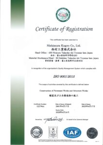 2001年にISO9001、2016年にISO14001を認証取得(認証範囲 舗装及び土木構造物の施工)し、維持することで自然環境との調和に配慮した良質な製品を提供することによりお客様の信頼と満足を確保しています。